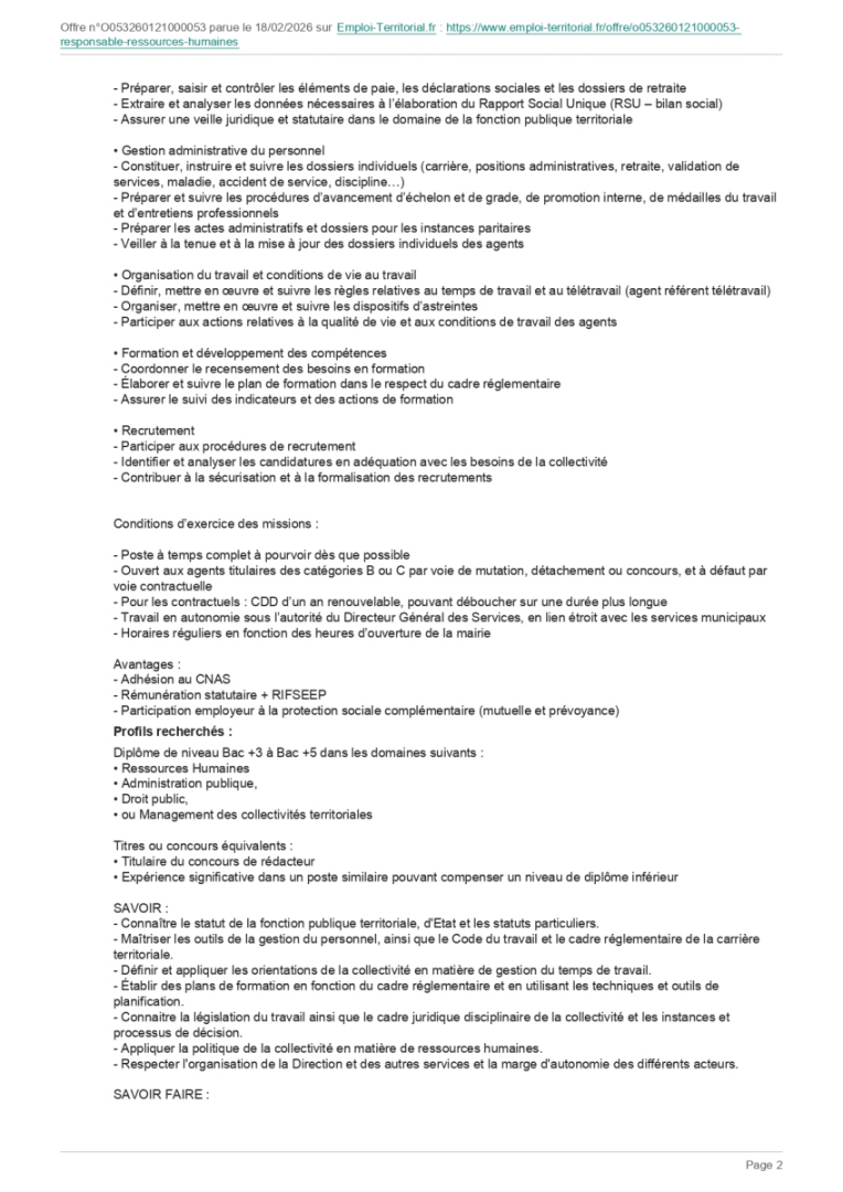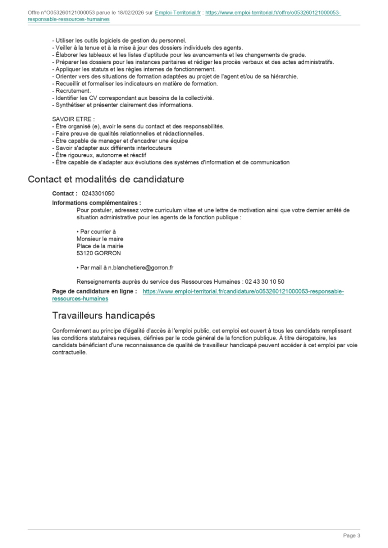 25 févr. 2026 dans Vie économique Offre d'emploi commune de Gorron (Responsable des ressources humaines)