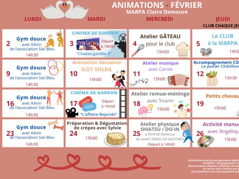 Planning Animations Février MARPA Date : Du 01 févr. 2025 au 28 févr. 2025 Horaire : voir planning Lieu : MARPA Évènement suivant BÉBÉ LECTEURS 06 févr. 2026 / 10h00 Bibliothèque de Châtillon Sur Colmont